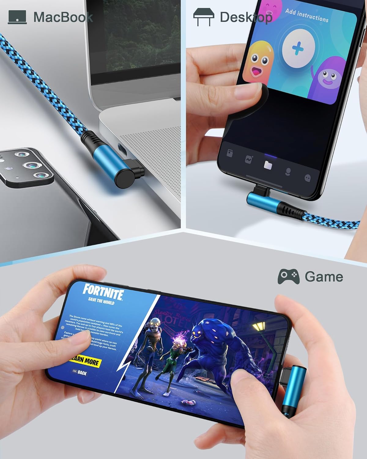 🔌 [UPGRADED 90° Right Angle & Case-Friendly Stepped Design]Features an innovative 90-degree L-shape connector. Our right angle usb c to usb charger cable reduces cord strain and allows you to comfortable phone while charging – Perfect for gaming, watching videos, navigation, reading, or media playback. The stepped plug design ensures a secure fit with most thick phone cases, preventing loose connections and maintaining a secure and stable connection – Ideal for daily use and Apple CarPlay