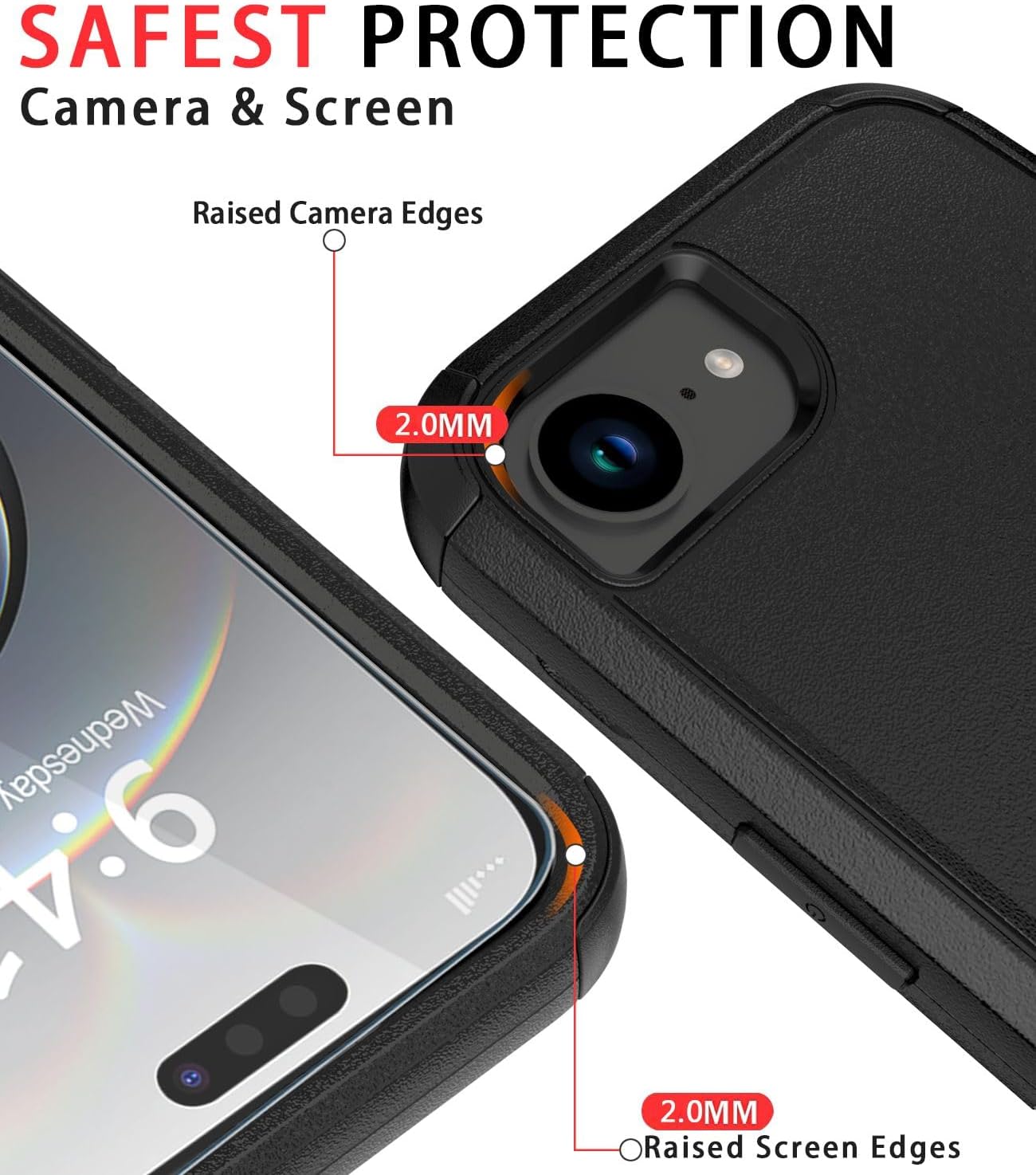 “Increase protection”: Raised bezels offer extra protection for screen and camera [When the phone is dropped on a flat area, the screen and camera do not touch the ground] Case has air bags at the four corners and is certified for 15 FT drop impact